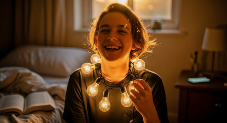 Candid portrait of a smiling person wrapped in warm Edison string lights in a cozy bedroom. Soft golden lighting creates an intimate, joyful evening atmosphere.