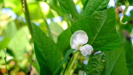 White flower of dwarf bean in ecofriendly country home garden.