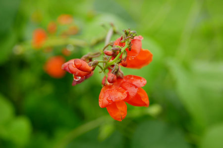 Beautiful flowers of Runner Bean Plant Phaseolus coccineus growing in the garden.