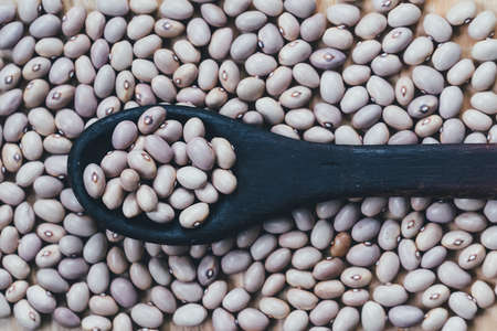 Light small beans in a black wooden spoon. Flat lay