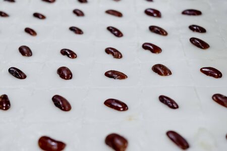 A pile of red beans, divided into two rows on the table made of ceramic. with copy space for your text.