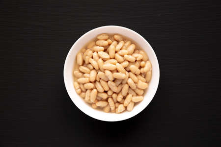 Organic White Cannellini Beans in a White Bowl, top view. Flat lay, overhead, from above.
