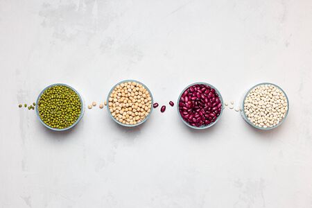 Legumes and beans assortment in different bowls on light stone background . Top view. Healthy vegan protein food.