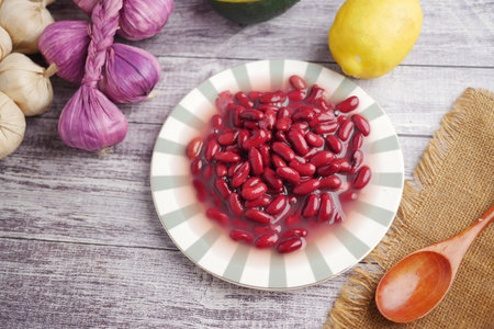 Red Kidney Bean on white wooden textured table, food background with copy space
