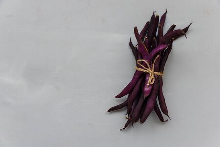 Purple beans (asparagus, kidney) on gray wooden background. Top view. Flat lay. Harvesting or healthy food concept.