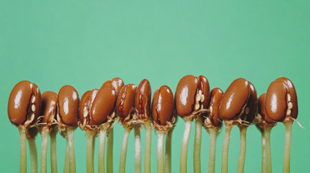 A collection of sprouting bean seeds with visible roots and stems against a vibrant green background, symbolizing the beauty of nature and growth.