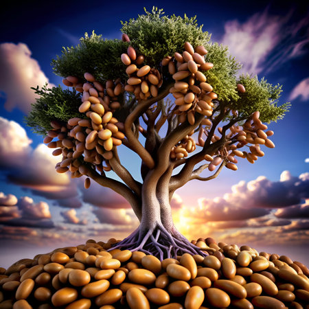 A whimsical 3D illustration of a bean tree. its branches laden with plump beans and nestled amidst a field of scattered beans. The tree stands against a vibrant sunset sky. creating a surreal and dreamlike scene. Perfect for whimsical designs. children's books. and eco conscious projects.