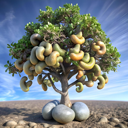A whimsical 3D illustration of a cashew tree. its branches laden with plump. colorful cashews. Perfect for illustrating health. nutrition. or tropical themes.
