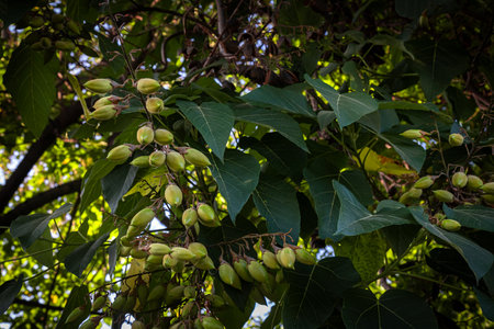 Green Paulownia tomentosa fruits with seeds on branches in summer. Princess or empress tree.