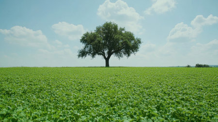 A solitary tree stands majestically in a vast green field under a blue sky filled with fluffy clouds, offering a peaceful and serene landscape ideal for nature lovers.