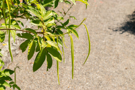 Bright green Catalpa tree leaves and seed pods in the garden in summer.