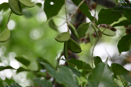Millettia pinnata fruits. It is a species of tree in the pea family Fabaceae. Its other names Pongamia pinnata, Indian beech and Pongame oiltree. Oil is extracted from its seeds.