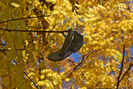 Pods of Kentucky coffeetree (Gymnocladus dioicus) on a tree in autumn.