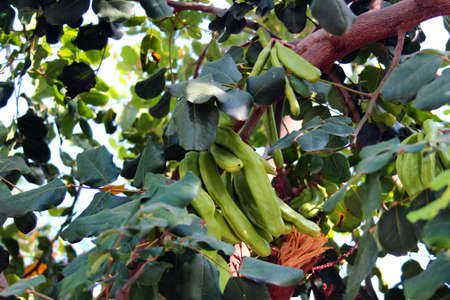 Green fruits of the carob tree maturing in the sun.