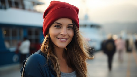 A young beautiful woman in a red hat, blue blouse and jeans stands on the pier in the port.