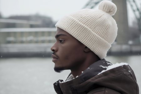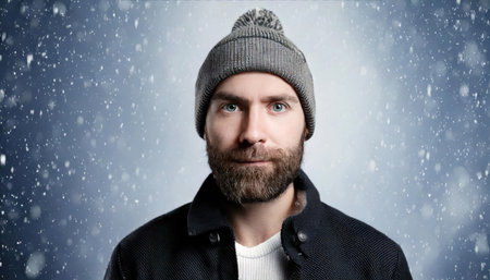 Stylish young man wearing a trendy beanie hat and a warm winter coat, posing in a snowy urban landscape filled with falling snowflakes