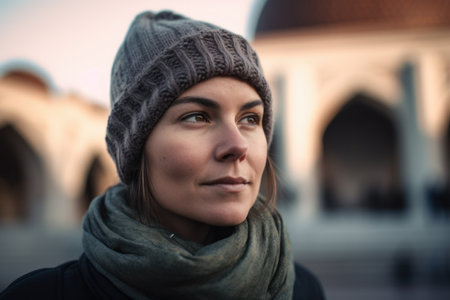 Portrait of a beautiful young woman in a knitted hat and scarf in the old city.