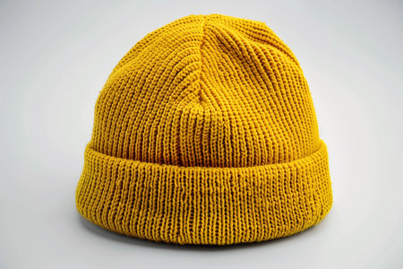 A yellow knitted hat laid flat on a white background, showing its intricate texture and vibrant color.