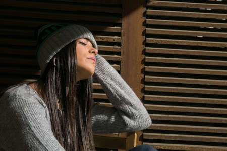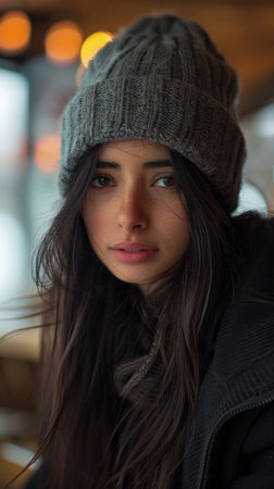 Portrait of a beautiful young woman in a warm sweater and a hat.