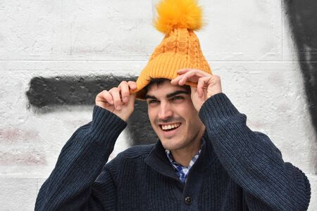 Close-up of a smiling young man putting on a yellow knitted bonnet with tassel