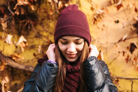Portrait of young positive beautiful smiling girl adjusting scarf in autumn. Good mood in any weather.