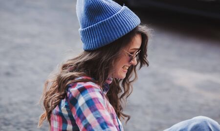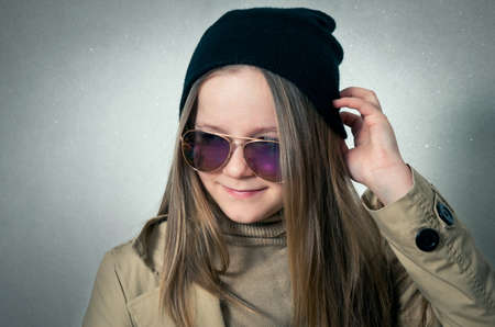 Cool cheerful girl with bright red lips wears modern knitted cap and sport jacket. Hipster style. Youth fashion.