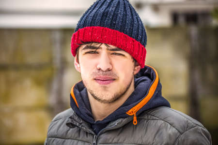 Young caucasian male teen wearing gray beanie outdoors with soft background.