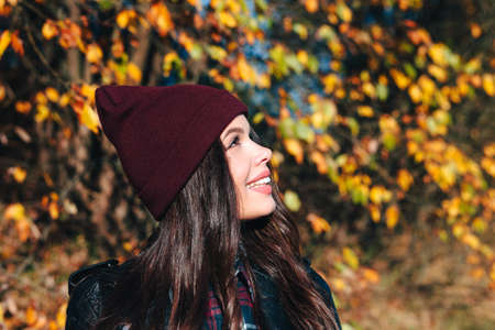 Happy young woman in a hat and a plaid shirt in autumn park looking away