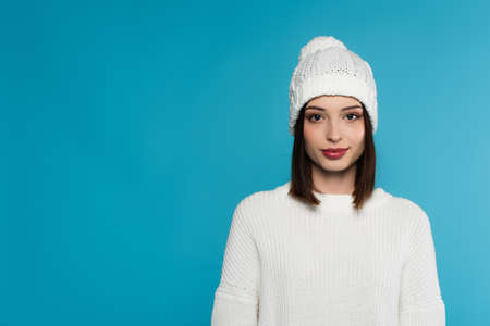 Pretty young woman in white hat and sweater looking at camera isolated on blue