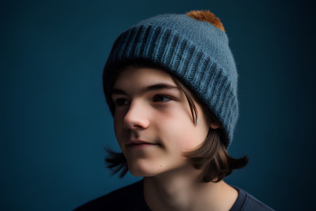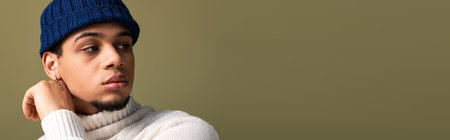 Stylish young man poses with a thoughtful expression, wearing a trendy outfit and knit hat.