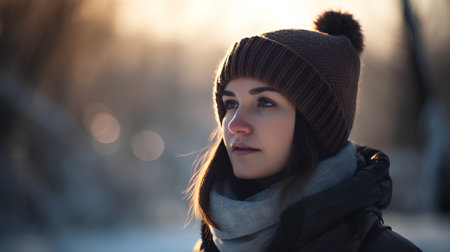 A young woman wearing a yellow knit hat stands in a snowy landscape. Flakes fall gently, creating a serene atmosphere as she gazes thoughtfully into the distance.