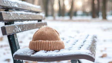 A soft wool beanie placed on a snowy bench in a wintery outdoor setting