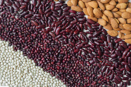 Multi-colored beans on a white background. Red and white beans in a background. Assortment of dried multi-colored beans, healthy ingredient. Bright multi-colored beans. A complete source of protein.