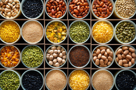 A vibrant display of various beans in colorful bowls showcases nature's bounty. Perfect for culinary themes, nutrition, and healthy eating concepts.
