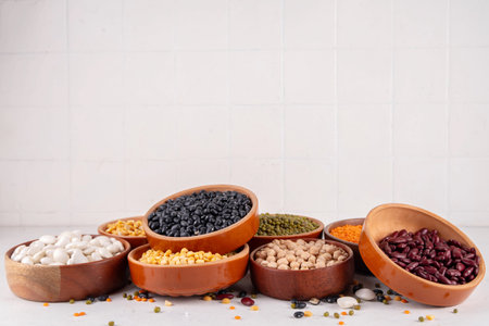 Various dried beans, lentils, mung, chickpea, pea assortment in wooden bowls. Legumes on white table top view. Vegan protein sources food, copy space