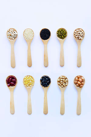 Cereal grains and Seeds beans(Black Bean, Red Bean, Peanut, Mung Bean, Thai Jasmine Rice, Brown Rice and White Rice) useful for health in wood spoons on grey background.
