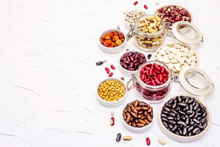 Assorted different types of beans. Set of various dry legumes, indispensable protein for a healthy vegan lifestyle, copy space