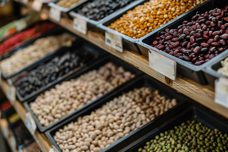 Variety of Beans and Pulses Displayed on shelf in grocery store in a Supermarket Bulk Section