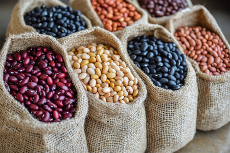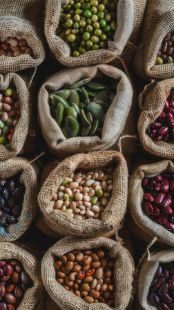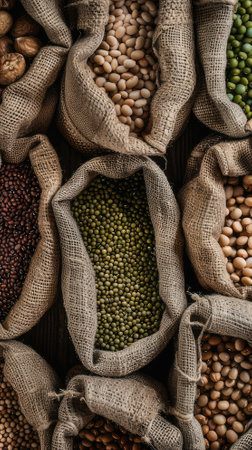 burlap bags overflowing with a diverse array of beans, including black, red, yellow long-legged, green round-shaped goldenuki, brown, navy blue, yellow, and white varieties