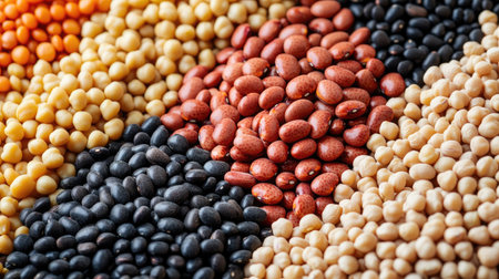 Different types of dry legumes like black beans, kidney beans, and chickpeas, spread out on a surface, ready for cooking and healthy meals