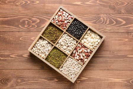 Different beans in the wooden box. Black eyed, borlotti, black turtle, red kidney, scarlet runner.