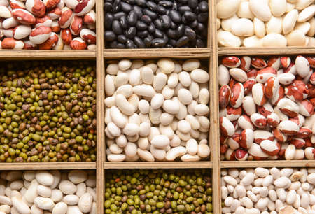 Box of different whole grains beans and legumes seeds lentils and nuts colorful snack background top view Collage various beans mix peas agriculture of natural healthy food for cooking ingredients