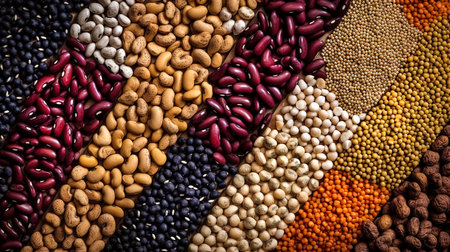 background seen from above with a large variety of dried legumes arranged in vertical rows