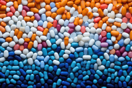 A lot of pills, close up background. Plastic capsules and tablets in pastel colors. Generative AI illustration