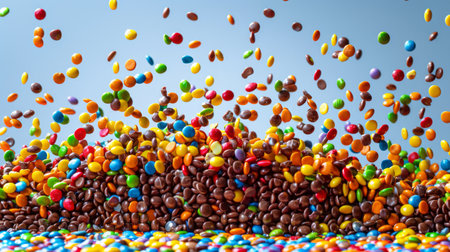 burst of multicolored candies explodes against a blue backdrop, creating a vibrant and playful scene.