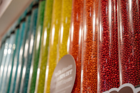 A vibrant display of jars filled with various types of beans, showcasing colorful ingredients ideal for cooking and healthy meals. Perfect for kitchen decor.
