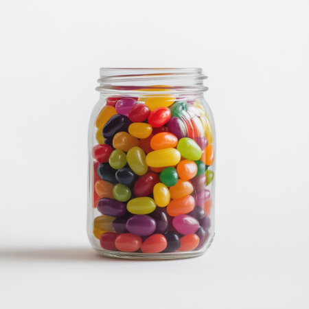 A clear glass jar is filled to the brim with an assortment of colorful jelly beans. The bright hues invite curiosity and delight, perfect for a candy buffet or decoration.