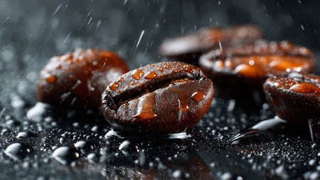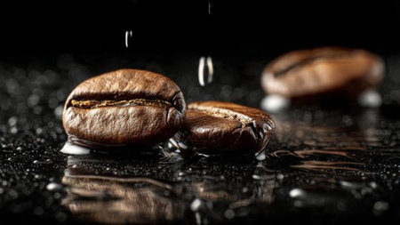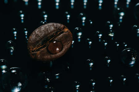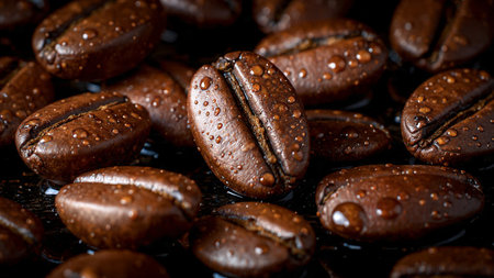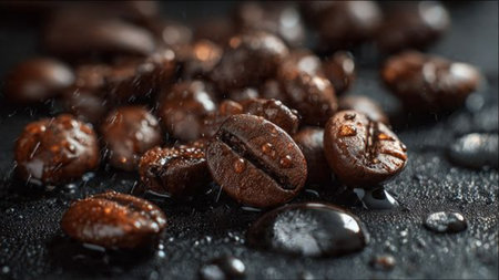 Coffee beans with drops of water on a black background.