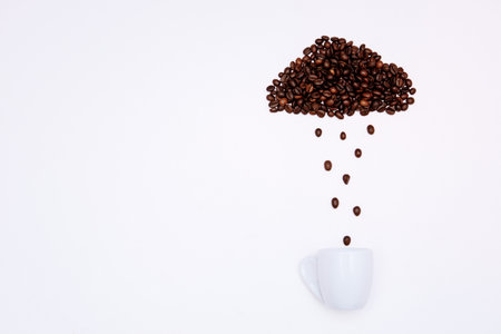 Cloud made of fresh coffee beans with rain drops into the coffee cup. Minimal coffee concept