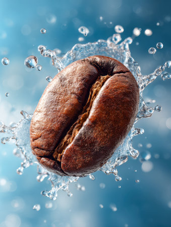 A dark roasted coffee bean collides with clear water, creating a lively splash that captures energy and motion in a striking, high-contrast scene.